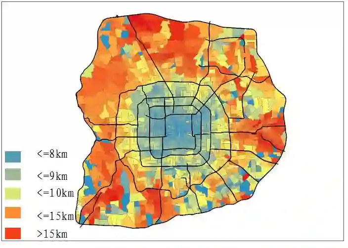 通勤出行是指以上下班、上下学为目的的出行,具有时空规律性强,刚性大的特点。北京市六环内通勤出行量日均2300万,占出行总量的52%,平均通勤距离12.4km,平均通勤时耗56min。以通勤距离度量北京市职住分离度,从二环到六环,职住分离度逐渐增大,五-六环间平均通勤距离高达15.6km(图1);快速路、高速公路沿线通勤距离更长(图2),五环外京藏、京通快速路、京港澳、京开沿线通勤距离均大于15km。