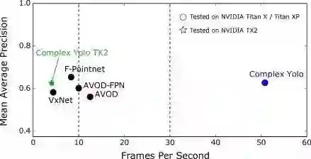 我们在一个专用的嵌入式平台(TX2)上对我们的网络进行了测试,并与五种领先的模型进行了比较,结果表明我们的网络具有合理的效率(4fps)。Complex-Yolo是首个用于实时3D目标检测的模型。