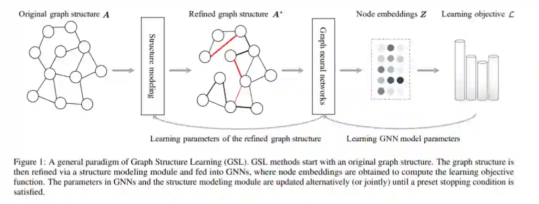 提高GNN模型的鲁棒性的一个主要关注点是为学习表示产生去噪的图结构[Jin等人,2020]。最近,大量的文献围绕着图结构学习(Graph Structure Learning, GSL)这一中心主题兴起,其目标是共同学习优化的图结构和相应的表示[Yu et ., 2020a]。不幸的是,许多GSL技术在不同的研究团体中被提出,它们从未被系统地调研过。为了在不同的研究之间建立联系并便于理解,在本文中,我们对用于鲁棒表示的深度GSL的最新工作进行了综述。具体来说,我们制定了一个通用的GSL范式,根据他们对图结构建模的方式对现有的工作进行分类,并突出每个模型的关键优点。此外,由于GSL在其他方面使GNN受益,我们将讨论在其他领域(如可解释性和图池化)合并GSL思想的应用。据我们所知,这是第一个全面回顾GSL研究最新进展的研究。