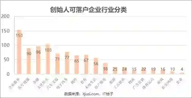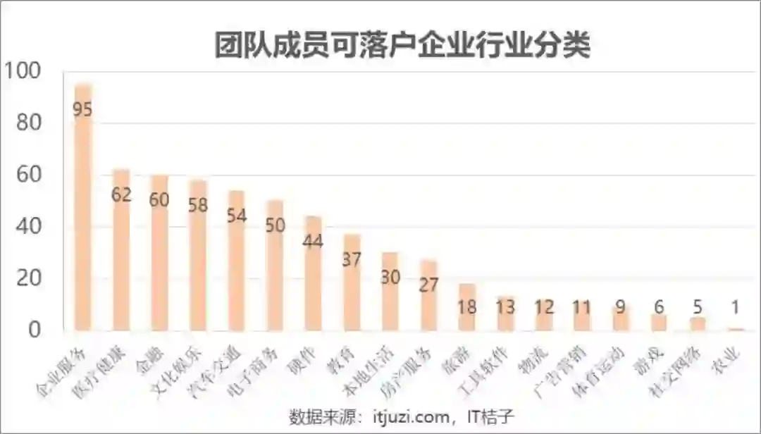 我们发现,同「创始人及核心成员落户企业行业分类」一样,企业服务领域企业的数量依然是最多的,共计有 95 家,远超排名第二的医疗健康领域企业。