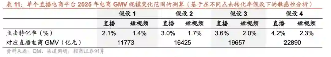 当转化率维持2021年直播2.1%,短视频1.4%的平均水平时,2025年单个直播电商平台的GMV将达11773亿元;