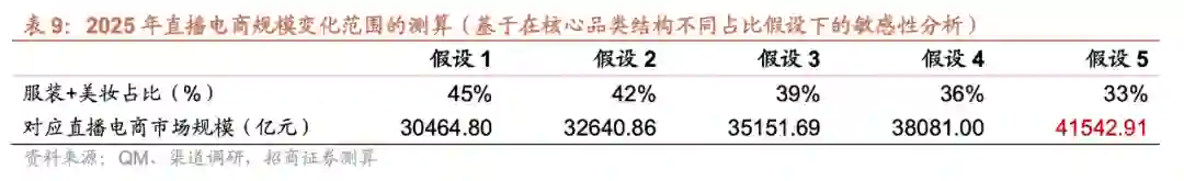 综上,招商证券基于这两大品类未来的线上化率、直播电商的销售占比、两大品类直播电商线上市占率进行假设,对2025年直播电商的规模进行测算。