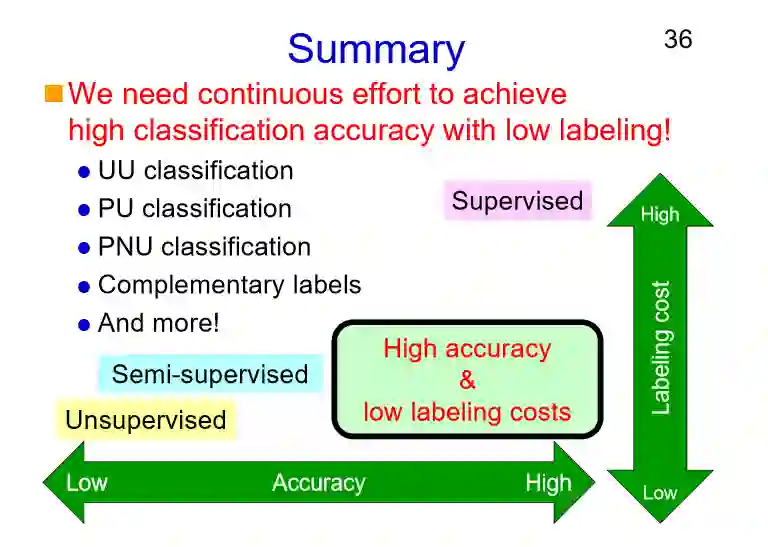 最后我们做一个总结,我们最关注的是底下的这栏,也就是高精确性,但同时也希望需要的标注成本能够尽量的低。我们在UU、PU、PNU和互补性标签分类上,都希望能够实现高精度低标注成本的目标。