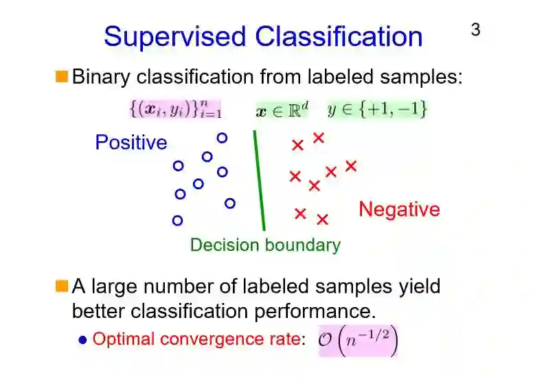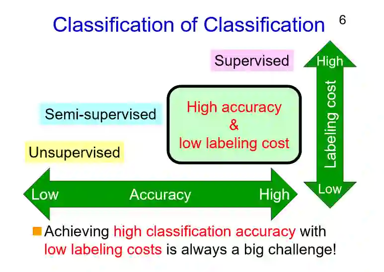对于不同类型的分类方法,标注的成本有高有低,所取得的分类准确率也有高有低。对于监督分类,能够取得很高的分类准确率但同时标注的成本非常高;而对于半监督和非监督分类,标注的成本都比较低(甚至没有),但取得的分类准确率并不高。