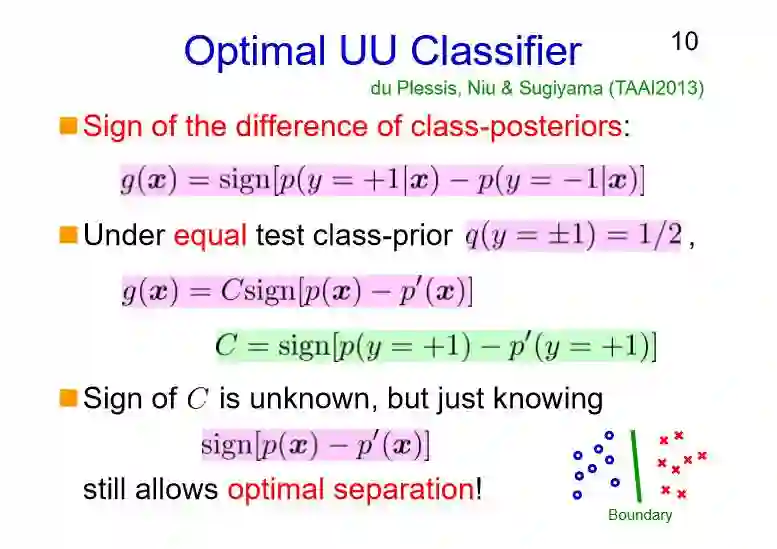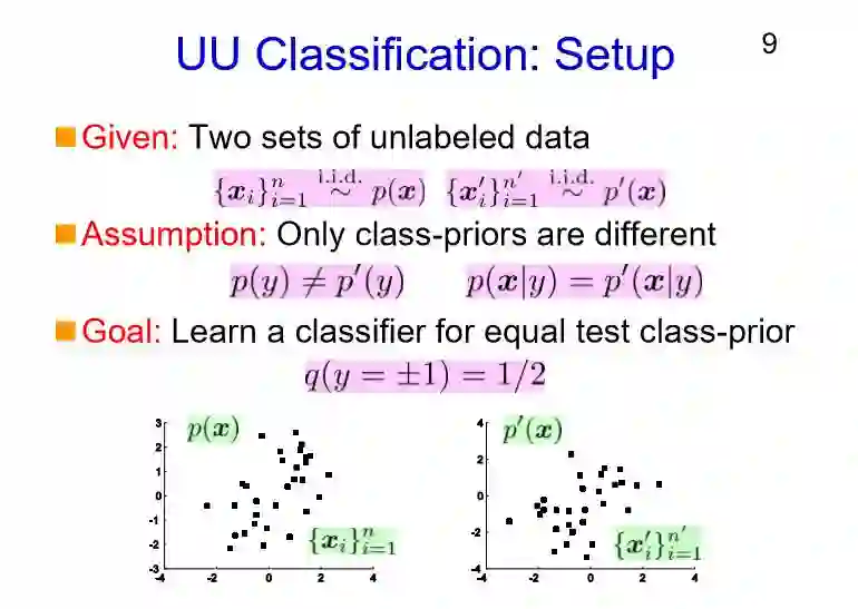 那么我们是怎样对无标注的数据进行分类的呢?假设我们有两个未标注的数据集,它们唯一的不同在于类先验(class-priors,即所属的类别)的不同。它们的函数分布如图中的左右下角,数量上各占50%左右,其实我们并不需要知道具体的比例。基于这种假设,我们需要训练一个分类器,而基于无标注数据的训练是极具挑战的。