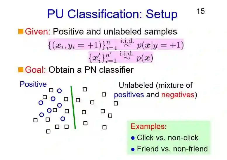 另外,我相信在社交媒体上面也会有这样的分类场景,判断一个用户是不是你的好友。对于已经认识的朋友,朋友之间有着很好的联系,所以我们能够得到相应的数据样本;然而,对于非朋友关系的用户们,我们并不知道他们相互讨厌对方所以没有成为朋友,还是如果有机会是能够成为朋友的,所以他们之间没有链接并不代表它就是负类的(不能成为朋友)。