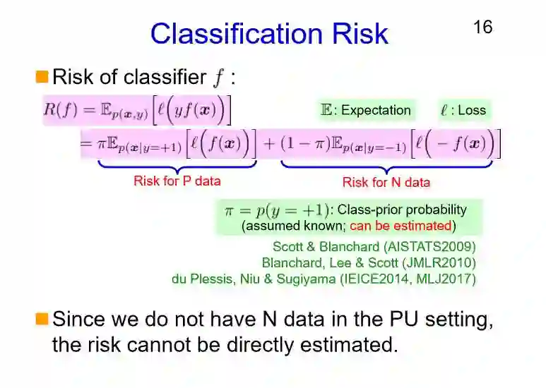 我们用到了损失函数,用了l表示; y是用f(x)表示;我们用R(f)表示风险函数,代表数据分类的风险,可以看到风险函数包括正类数据的分类风险以及负类数据的分类风险。在今天的演讲当中我们为了把它讲的简单,这里实际是要通过这些数据来进行估计的。