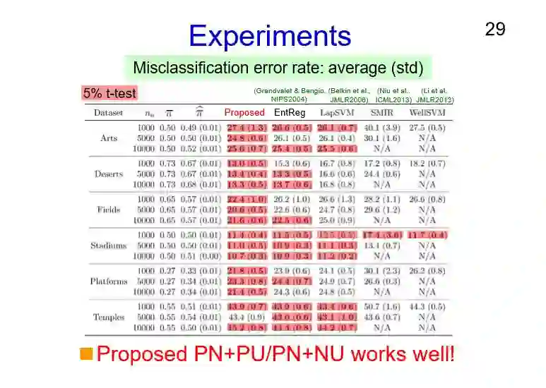 我们现在应该可以做一些类似平滑的正则化,这边其实并不好解释,也就是说可能在无标注数据当中获得标注数据。如果我们和其他的一些标准方法做一个比较的话,这样的一个PU加NU,PN加PU的方法所取得结果是非常好的。