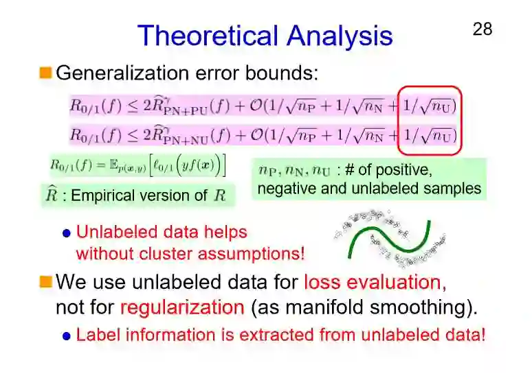 我们再来看一下泛化误差边界:所有的数据和类型其实已经看到了,最后NU一个错误率这边还是存在的。换句话说,如果我们能够使用未标注的数据,哪怕没有簇假设(一个聚类簇对应一个标注类别)也能够控制泛化误差在一定合理的范围之内。一开始我们无标注的数据只是对它进行一个传播,但是这样的一些无标注数据,更多只是用于这样的损失和评估,而并不适用于正则化。