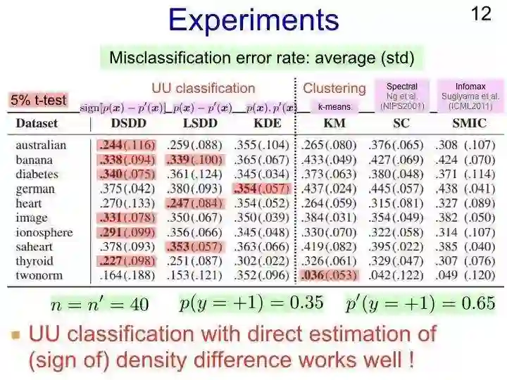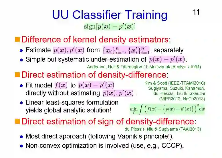 接下来的做法都是很直观的。因为我们要处理的是一些未标注数据,第一种方法是做核密度的估计,我们对两类数据点对应的p(x)和p’(x)进行估计,从而计算它们之间的差值,这样能够很自然地解决分类问题。然而,遗憾的是这种方法虽然简单,但有可能对p(x)-p’(x)的差值产生了低估,这是因为对p(x)和p’(x)的估计函数过于平滑所导致的。