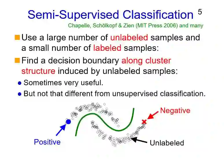 我非常喜欢11年前提出另一种方法的论文:由于我们有大量的无标注数据和少量的标注数据,那么基于少量的标注数据就一定程度上找到边界,然后结合所找到的边界和大量无标注数据的聚类结果,从而找出更多的边界。这就是半监督分类。
