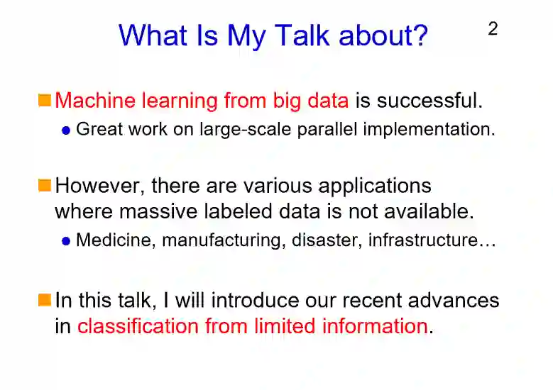 昨天漆远谈到了金融领域的机器学习,从大数据的角度来看,它是机器学习很重要的研究领域,并且目前还是非常的成功,我也一直对基于大数据来做机器学习这件事情非常感兴趣。然而,现在对于很多的应用领域而言是无法获取大规模的标注数据的,比如医药、制造业、防灾等领域。当数据量不够时,我们需要相应的机器学习方法来应对。