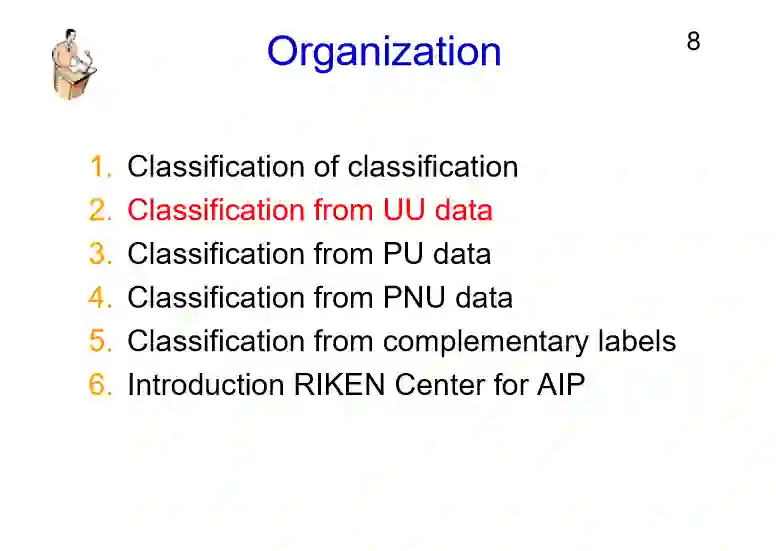 下面是今天演讲的议程,接下来会给大家介绍四种不同的分类方法,后面如果有机会我会介绍一下理化学研究所AIP研究中心。