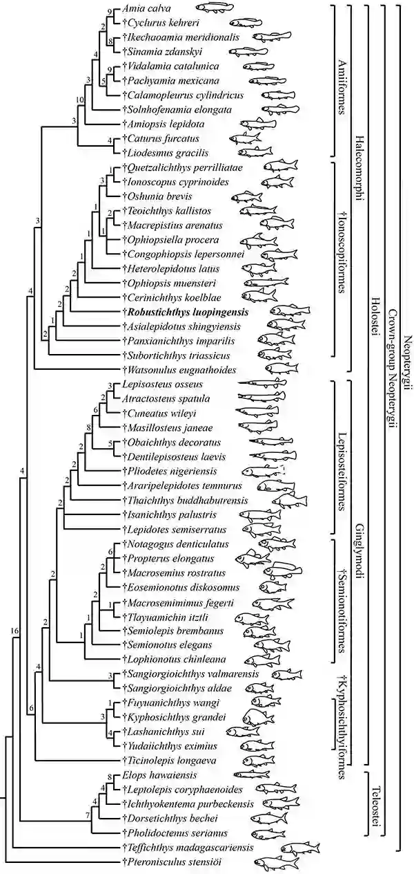 全骨鱼类分为铰齿鱼类和近鲱形类,分别以雀鳝和弓鳍鱼为现生代表。由于全骨鱼类与真骨鱼类(现生脊椎动物中最大的类群)的姐妹群关系,全骨鱼类在新鳍鱼类乃至整个辐鳍鱼亚纲的研究中具有举足轻重的地位。罗平强壮鱼是云南罗平生物群中体型最大的一种全骨鱼类,全长可达40厘米,发现于云南罗平中三叠世安尼期(2.44亿年前)海相地层。现已查明,它也是世界范围内中三叠世(距今2.37-2.47亿年前)地层中所发现的最大的全骨鱼类属种,对于重建三叠纪海洋脊椎动物生态环境无疑具有重要的潜在价值。自2014年首次报道并命名以来,罗平强壮鱼成为全骨鱼类研究中备受关注的化石物种。然而,不尽如意的是,因为最初化石数量较为稀少,一些关键的骨骼特征不清楚导致罗平强壮鱼在全骨鱼类中的系统分类位置成为争论不休的问题。一些研究者认为它是近鲱形类的成员,但另外一些研究者将它归入铰齿鱼类。