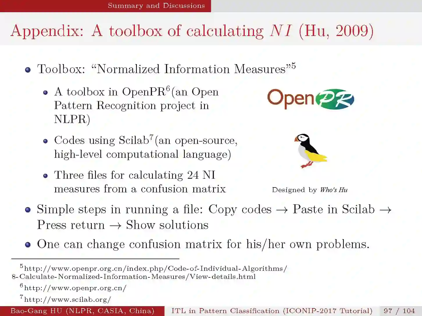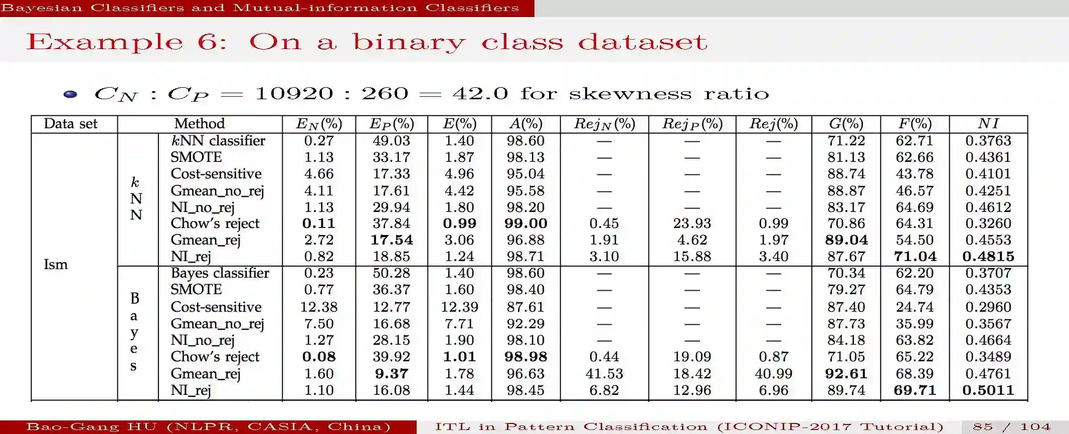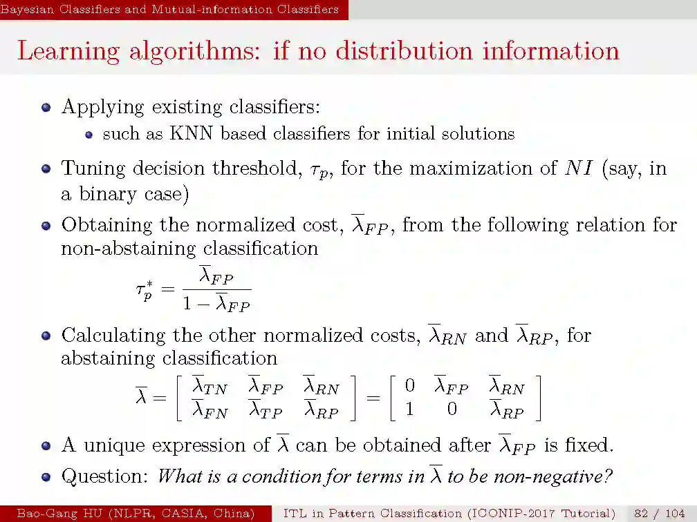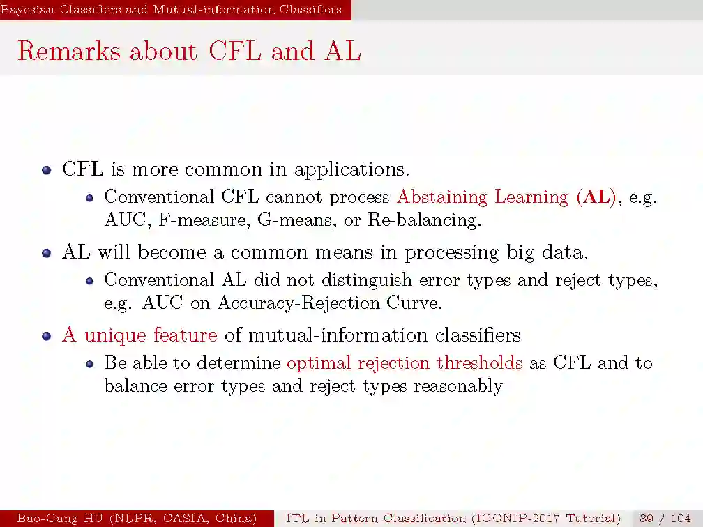 第5章总结:本章主要是基于拒识学习中考察互信息分类器与贝叶斯分类器。为了理解互信息分类器与已有分类器的不同,我们将贝叶斯分类器作为参照物。在考察贝叶斯拒识分类器设计中我们受到来自于华人学者周绍康先生开创性研究工作的启发。阅读周先生1970年文章之后让我们思考应该发展贝叶斯二值拒识分类器一般形式的理论方法。由此产生了第69至71页中新的贝叶斯二值拒识分类计算公式。周先生的计算公式(不区分误差与拒识类型)成为其中一种特例, 他还设定了关系式:误差代价> 拒识代价>正确分类代价(Chow, 1970, 公式(22)之后)。而我们可以从理论中导出这样的关系式。69页与83页中的图形都是新的基础知识,需要读者理解并能够解释。另一方面我们首次考察了拒识分类以及多值分类中代价矩阵的独立参数个数,这与分类器类型无关。