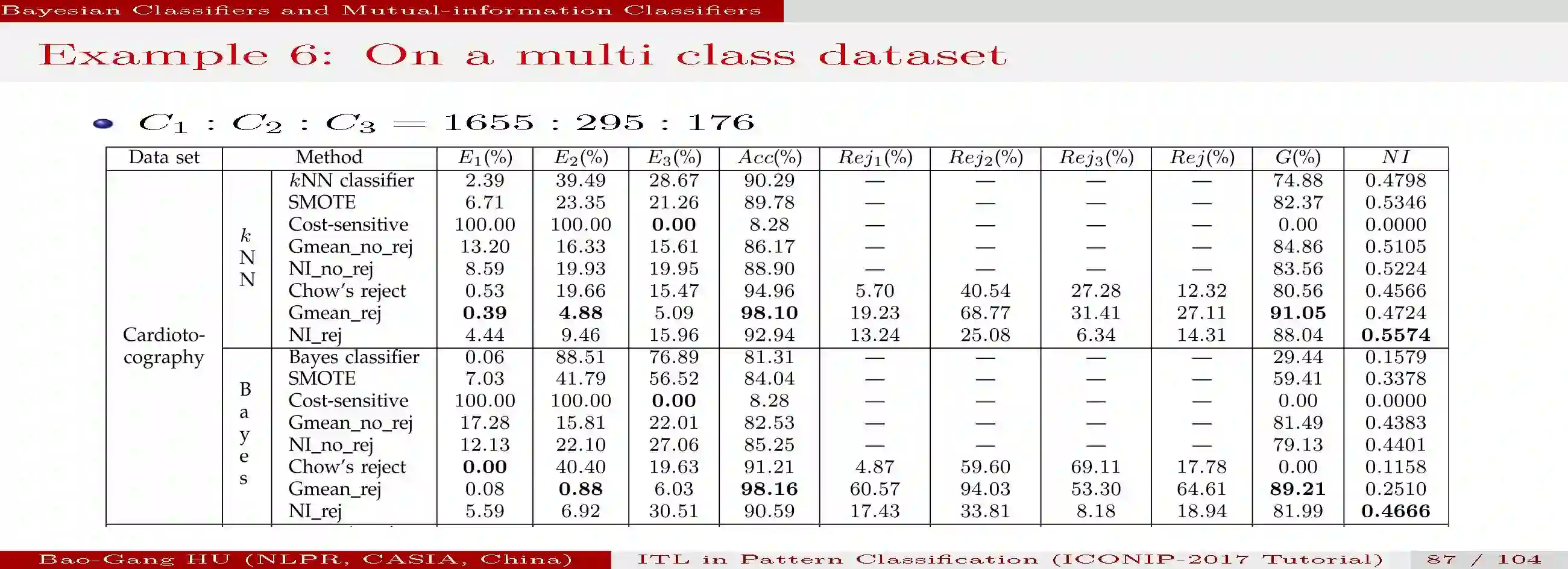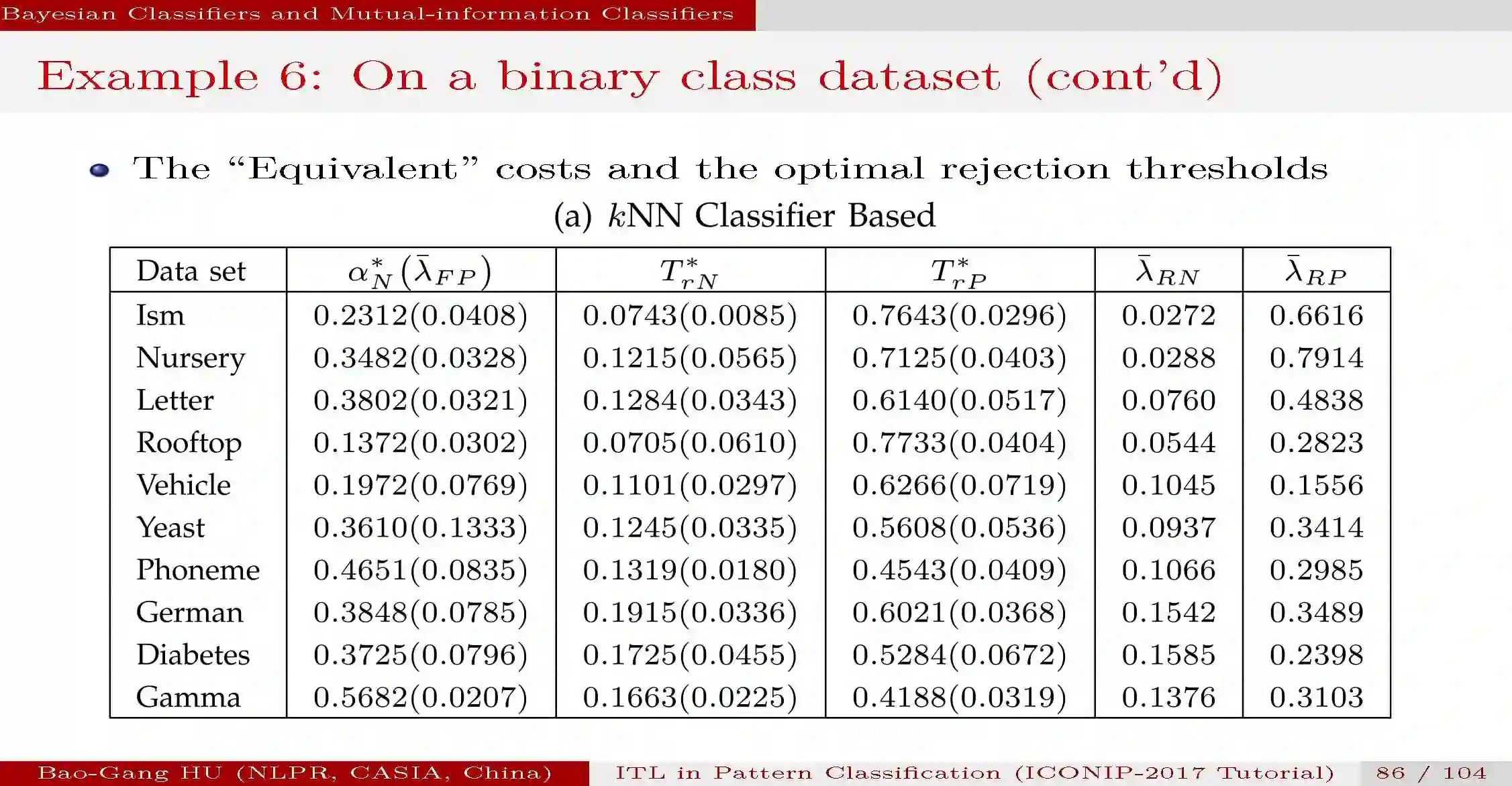 该章前面的例题都是解析解。对于真实数据下面展开了互信息分类器的具体研究,前提是没有分布信息。这就涉及了学习算法。为此我们采取应用传统分类器计算初值,在获得混淆矩阵结果后,应用互信息为学习目标。其中我们先计算无拒识类别下的情况,在调整归一化代价参数下获得最大互信息后,该归一化代价参数固定。开始计算拒识类别情况,其中有两个新的归一化代价参数,获得最大互信息后,可以获得唯一解释的三个归一化代价参数。