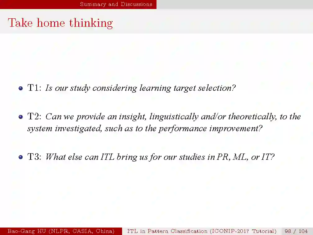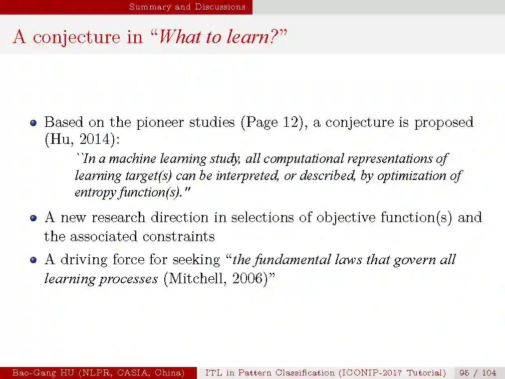 本次tutorial的目的是,1.介绍信息学习理论与模式识别的基本概念与原理;2.揭示最新的理论研究进展;3.从机器学习与人工智能的研究中启发思索。由于时间有限,本次只是大概介绍一下本次tutorial的内容,后续会详细介绍每一部分。