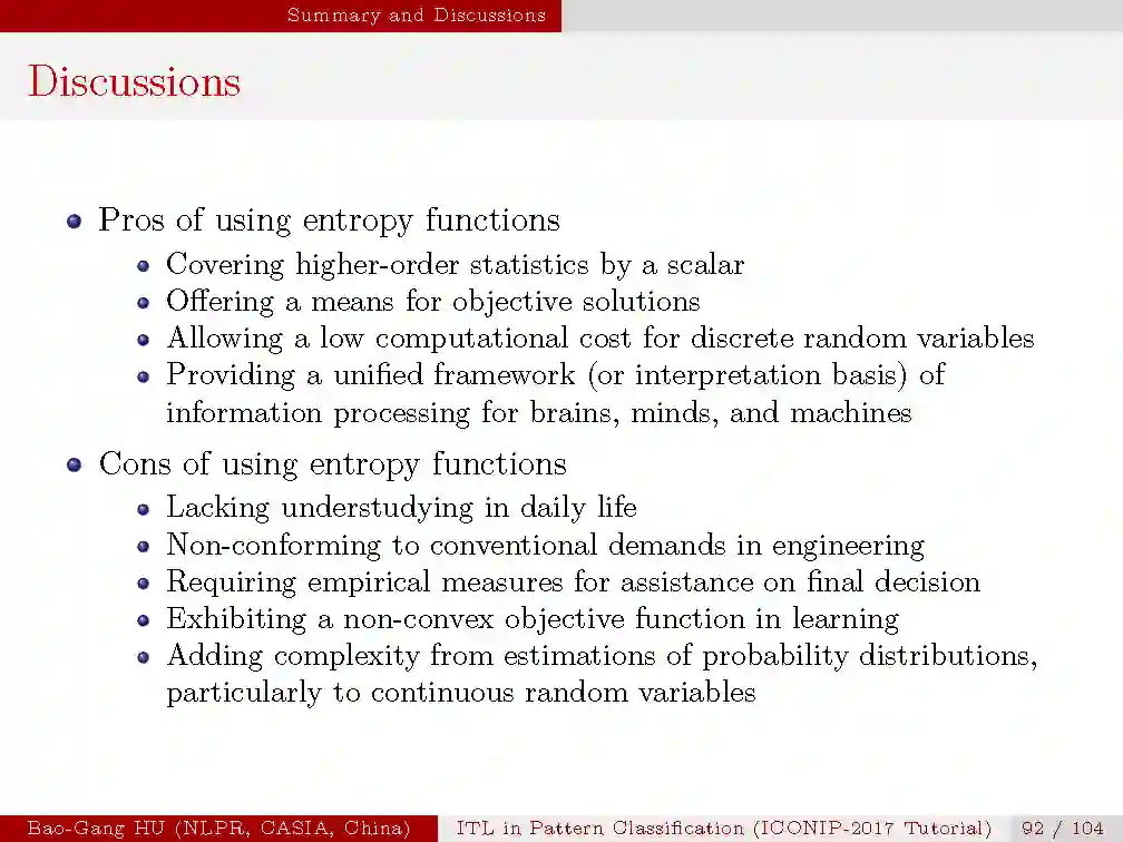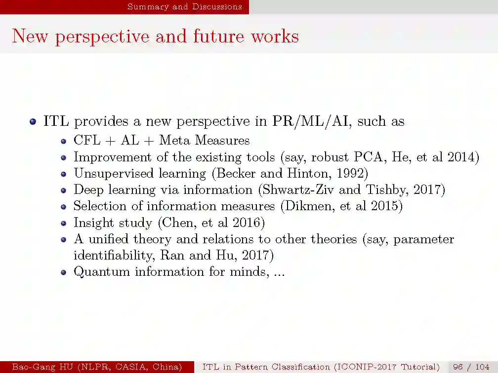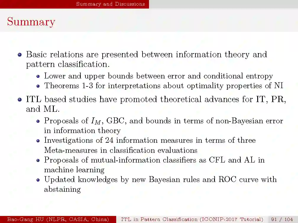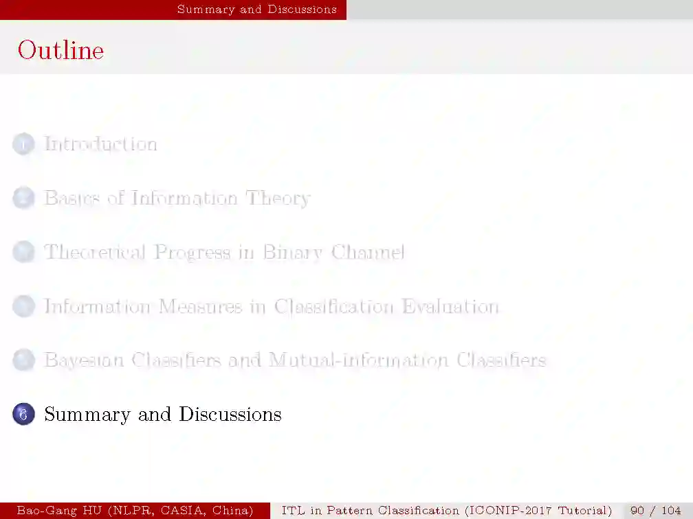 本教学课程介绍了信息论在模式分类中的基本关系。基于信息论理论的机器学习研究将会对信息论,模式识别等领域都是促进发展。其中我们给出了若干研究后的新进展。