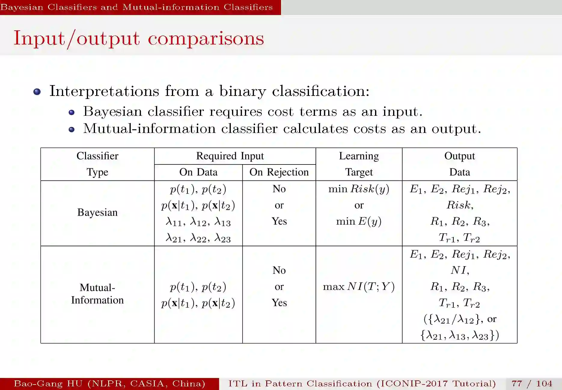 表中对比了贝叶斯与互信息分类器的输入与输出情况。当贝叶斯分类器需要代价矩阵或拒识门槛值作为输入量时,互信息分类器是将其变为输出结果。