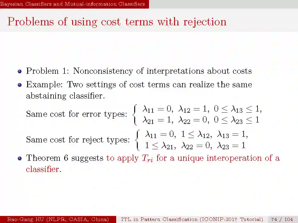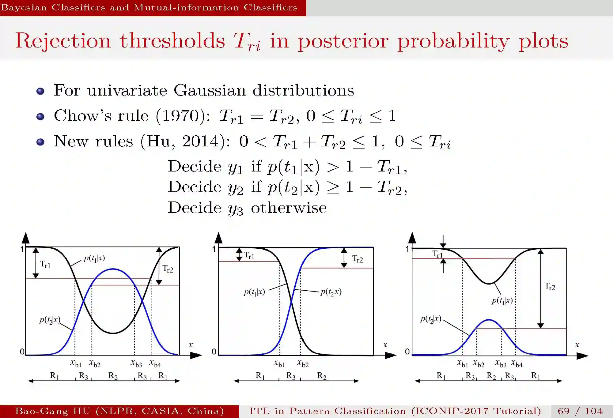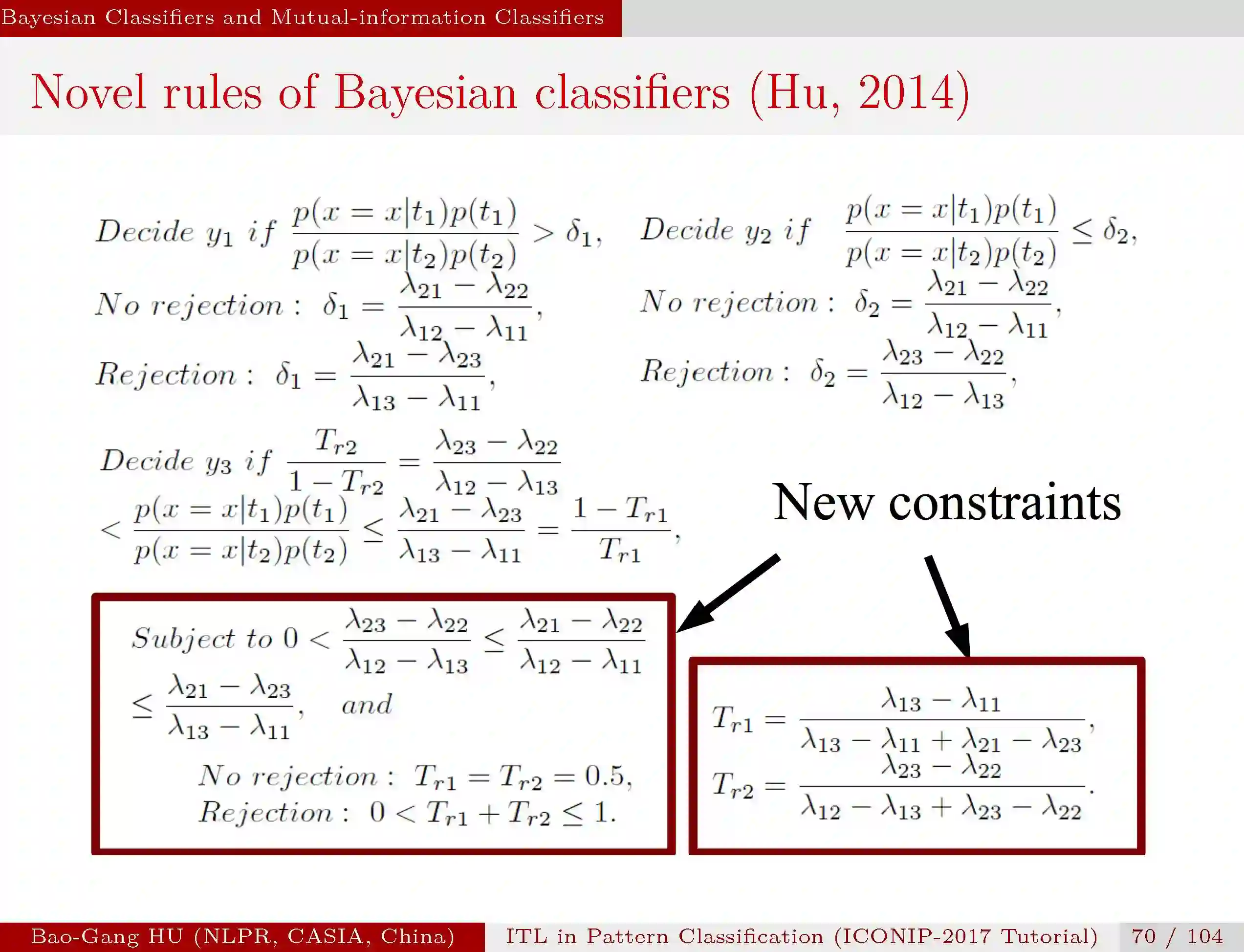 这里的推断规则等价于上页中的规则,只是表达中换为代价矩阵元素。我们推导了拒识情况下的拒识门槛值Tr1和Tr2与代价矩阵元素的关系式,并给出了各个变量的不等式约束关系。