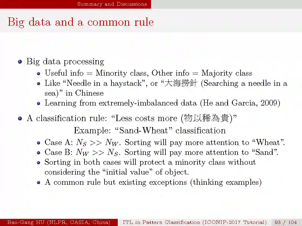 人们日常活动可以认为是处在大数据处理中。在这样背景下讨论并理解人类应用何种智能准则是十分重要的。 其中一个智能准则就是有效保护小类,因为相对于大数据有用信息通常是小类。我们应用“沙与米”的多少变换说明“物以稀为贵”在许多应用中是常规的智能准则。但是应用中也会有例外,你能够举出实例吗?