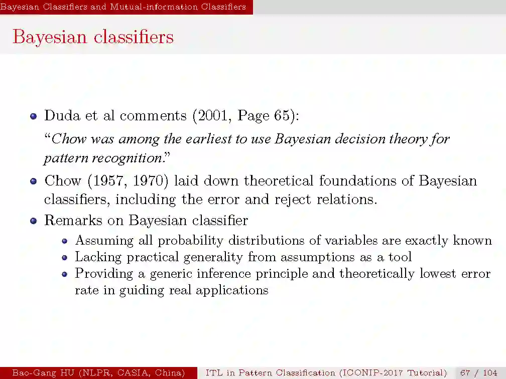 在《模式分类》这个经典教课书中,Duda等人认为周绍康(C.K. Chow)是将贝叶斯决策方法应用于模式识别研究中的先驱学者之一。华人学者周绍康分别于1957年与1970年的两篇文章奠定了贝叶斯分类器基础方法以及其中误差率与拒识率之间的理论关系。