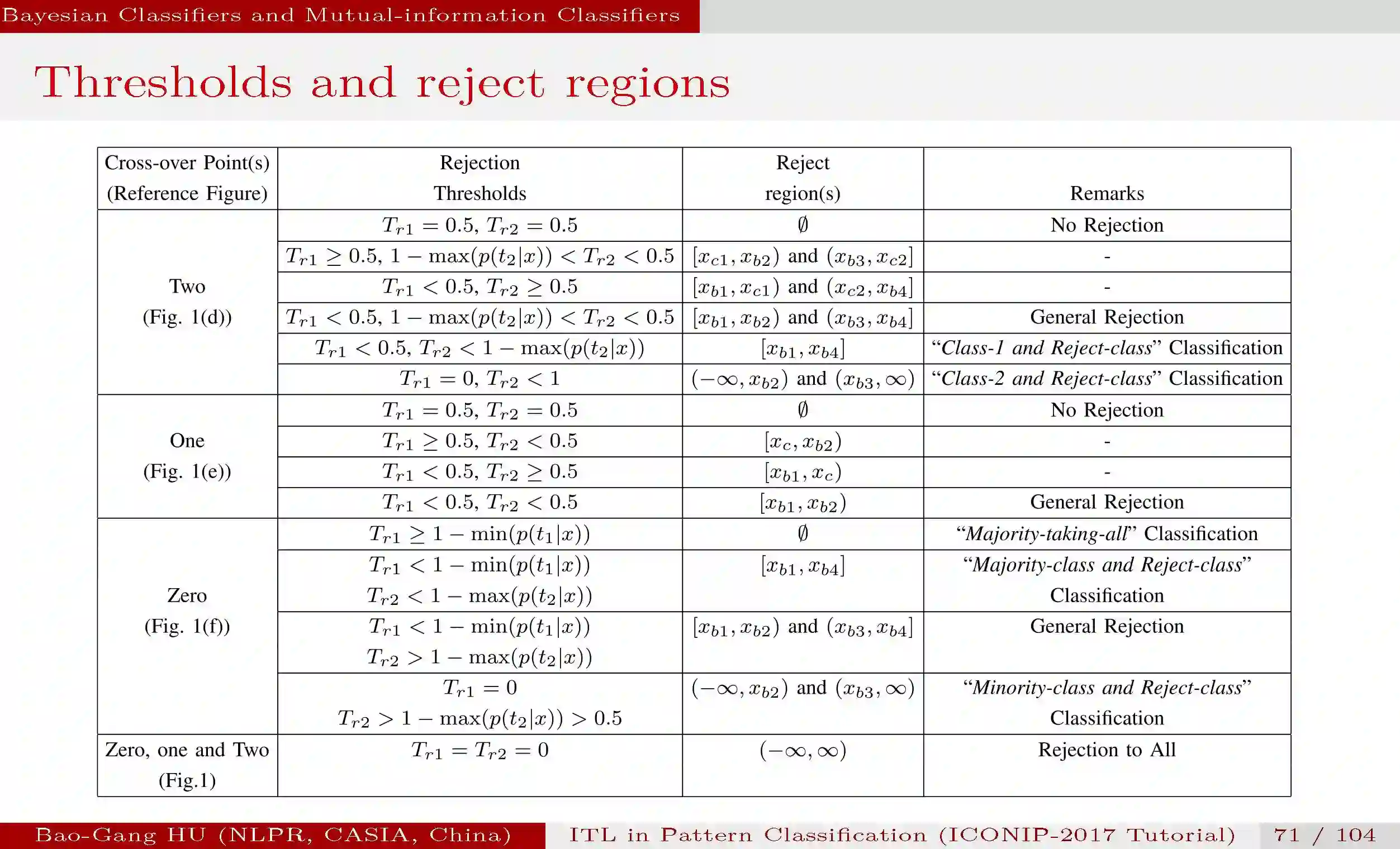 Tr1与Tr2分别为拒识门槛值。周先生1970年文章给出Tr1与Tr2分别在0与1之间。我们进一步给出了两者之和必须满足在0与1之间的约束。同时给出了一般情况下的推断规则。当Tr1与Tr2都设定为0.5时,则恢复到无拒识分类情况。