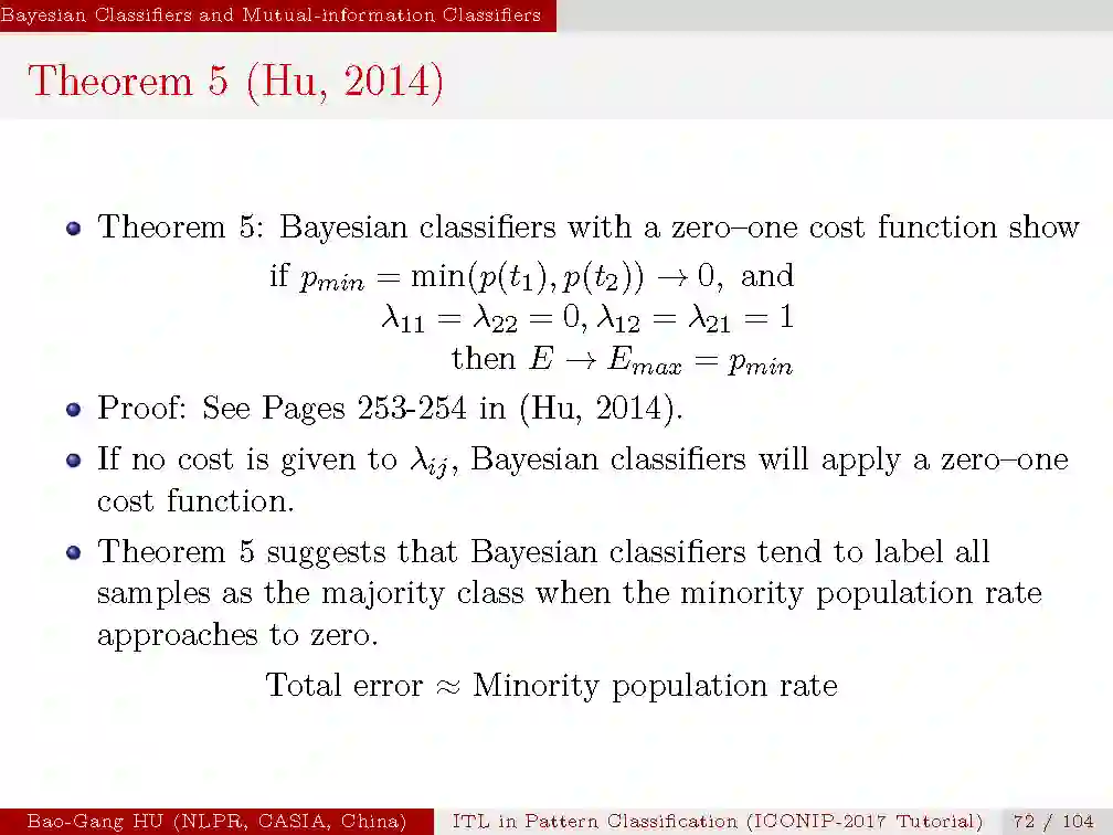这个定理告诉我们贝叶斯分类器并不在本质上能够保护小类。另一个解释可以是:为取得理论上最小的分类误差,贝叶斯分类器宁愿牺牲小类样本。具体证明见原文。