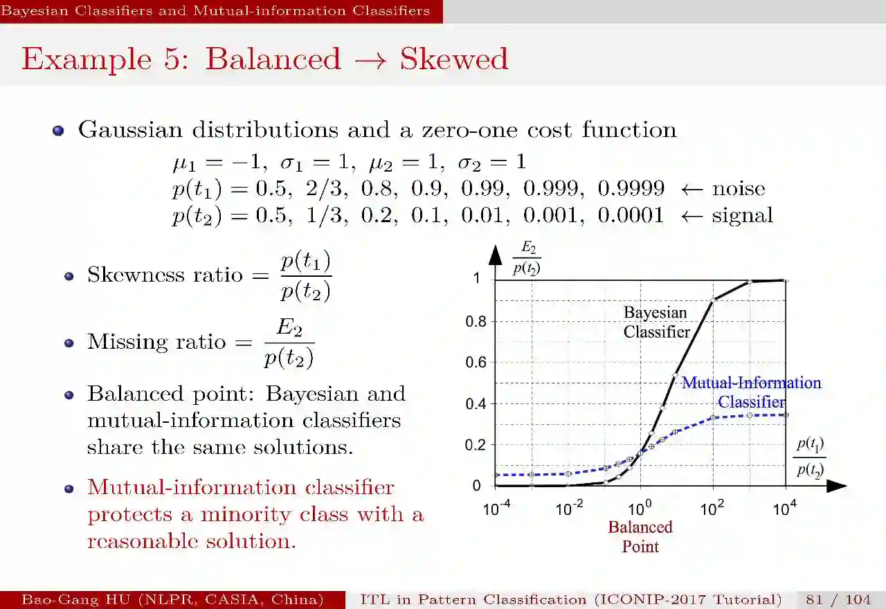 图中横坐标为不平衡比,纵坐标是漏检率。两个曲线分别对应了两种分类器。交叉点对应了类别为平衡分布(p1=p2)。可以看到,当不平衡比趋于极端时,贝叶斯分类器的漏检率是100%。而互信息分类器的漏检率是低于40%,说明它至少是一个有用的弱分类器。