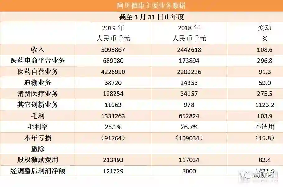 5月16日,集医药电商、消费医疗、互联网医疗、智慧医疗等业务于一身的阿里健康,发布2019年财报——财年收入50.96亿元人民币,同比增长108.6%;毛利13.31亿元,同比增长103.9%。扣除股权激励费用之后,利润净额达1.22亿元。