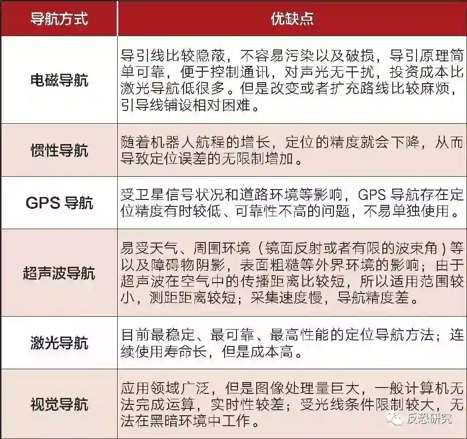 反恐机器人对环境的适应能力、行走精度、稳定性要求较高, 目前采用较多的是激光导航和视觉导航。现有导航方式各有利弊, 独立的导航方式在导航精度、稳定性上都存在局限性, 而多种导航方式的组合是重点研究方向。