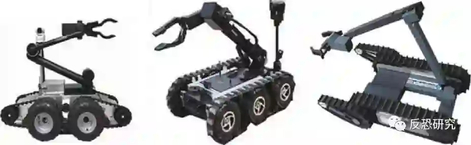 排爆机器人主要用于对爆炸物的转移和处置, 用于转移爆炸物的机器人要有良好的机动性能, 一般带有多个可更换臂爪, 有良好的翻沟越障能力;用于处置爆炸物的机器人在现场主要是模仿人对爆炸物进行抓、拿、铲、推、翻以及水枪摧毁等技术动作, 在技术要求上更侧重于本身的坚固性和排爆的可靠性。如加拿大Inuktun公司研制的VGTV侦察机器人, 英国ABP公司生产的Cyclops、Bison、Ground-hog、Lyn等型号排爆机器人, 美国研制的小型Dragon Runner排爆机器人, 加拿大Pedsco公司生产的排爆机器人RMI。如图1所示的三种应用较多的外国反恐机器人, 这些侦察、排爆机器人应用范围广、各有特色, 在工作环境适应性、排爆可靠性方面都有独特设计。