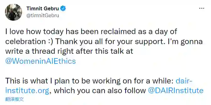Gebru 认为,在使用人工智能技术的过程中,其可能产生的危害是可以预防的,AI应该为人们服务,而不是给人类带来不幸。基于 DAIR,Gebru 旨在创造一个拥抱道德、维护大众福祉的研究环境。