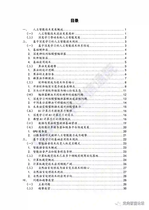 白皮书选择以深度学习算法驱动的人工智能技术为主线,第一,对人工智能发展的技术历史进行了简单回顾,阐述了深度学习带动本轮人工智能产业发展的根本原因;第二,围绕算法,数据和算力的“三驾马车”,分析了机器学习算法、AI加速芯片、训练及推断数据、软件框架、编译器等基础技术的基本情况、现状和特点;第三,系统梳理了基于深度学习的智能语音,计算机视觉,自然语言理解这三大基础应用技术及其发展的现状、应用领域。第四,提出了目前基于深度学习的人工智能技术发展问题和趋势。
