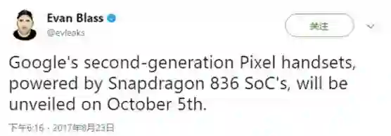 紧接着在今天上午,爆料大神evleaks在推特表示,下一代Pixel手机定于10月5日发布,搭载骁龙836芯片。