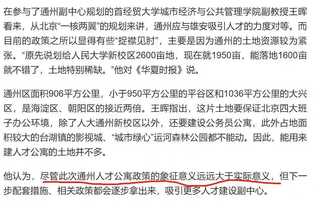 海淀区对高层次人才的吸引力也比通州要强。5月19日上午,在中关村科学城创新发展发布会上,海淀区区长戴彬彬发布了优化“海淀区人才公租房保障和管理”、“海淀区构建高精尖经济结构产业空间资源管理和利用实施意见”两个政策,放宽户籍限制,申请人不再要求具有本市户籍,只需申请当月前3个月在海淀区工作并连续缴纳社保即可。放宽住房限制,申请人及家庭成员在本市有住房,但距离申请人工作单位超过15公里的,也可申请人才公租房。对于博士、技术能手等第五、六层级的人才,吸引力更强。