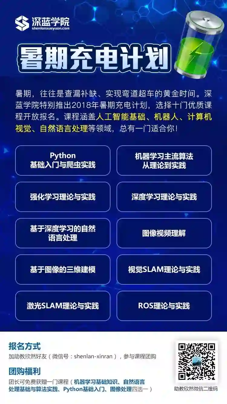 暑期是集中学习、查漏补缺、弯道超车的黄金时间,为了帮大家夯实基础、真正入门人工智能领域、找到志同道合的学习伙伴,深蓝学院特别推出2018年暑期充电计划,选择以下十门优质课程开放报名。课程涵盖人工智能基础、机器人、计算机视觉、自然语言处理等领域,并且参与旷视(Face++)企业奖学金的评选。总有一门适合你!