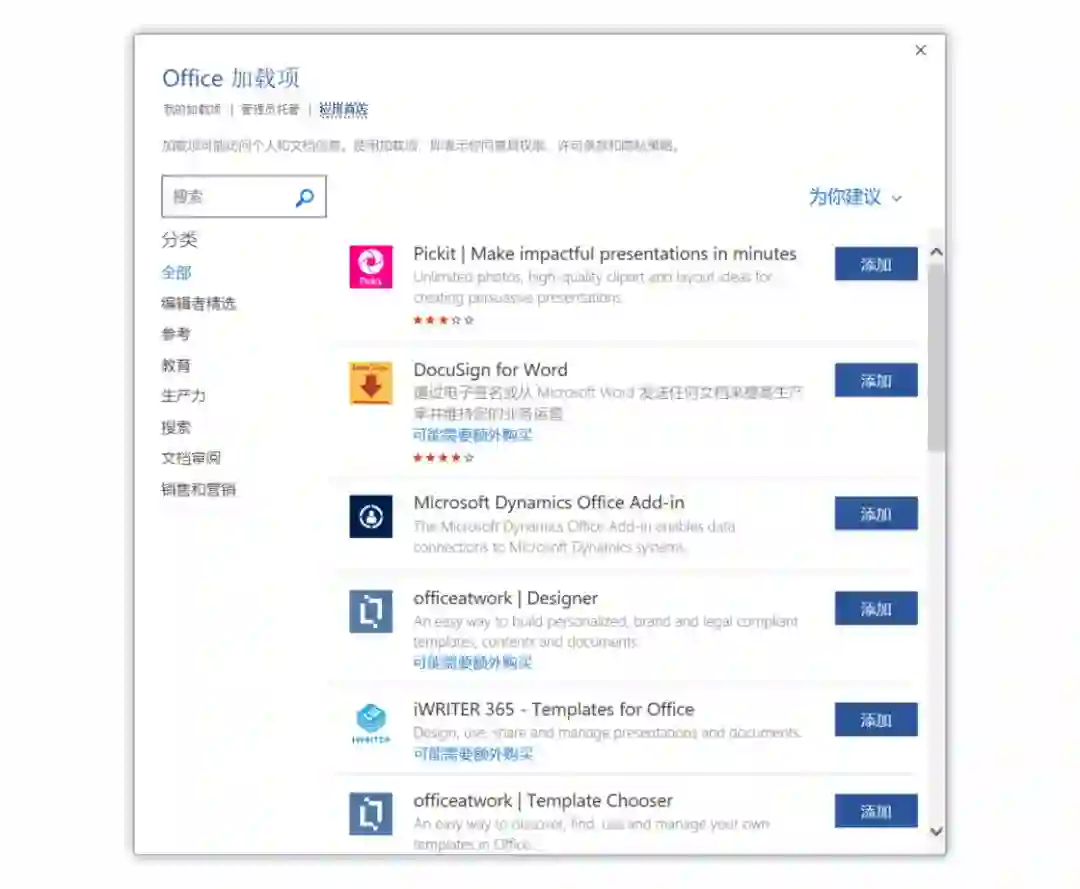 不过,经过我实测,这里的插件推荐很过时,编辑精选第一位的插件最后一次更新时间竟然是 2011 年。😓 因此,除了直接在 Office 自带商店浏览推荐插件,在 Microsoft AppSource 市场也可以查看下载推荐插件。这里的插件更多的是面向企业市场,但是我们同样也可以参考安装。