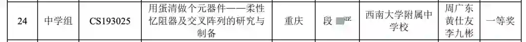 再来看这位段某严同学,全重庆市唯四获得一等奖的同学。他的研究是「用蛋清做个元器件——柔性忆阻器及交叉阵列的研究与制备」。