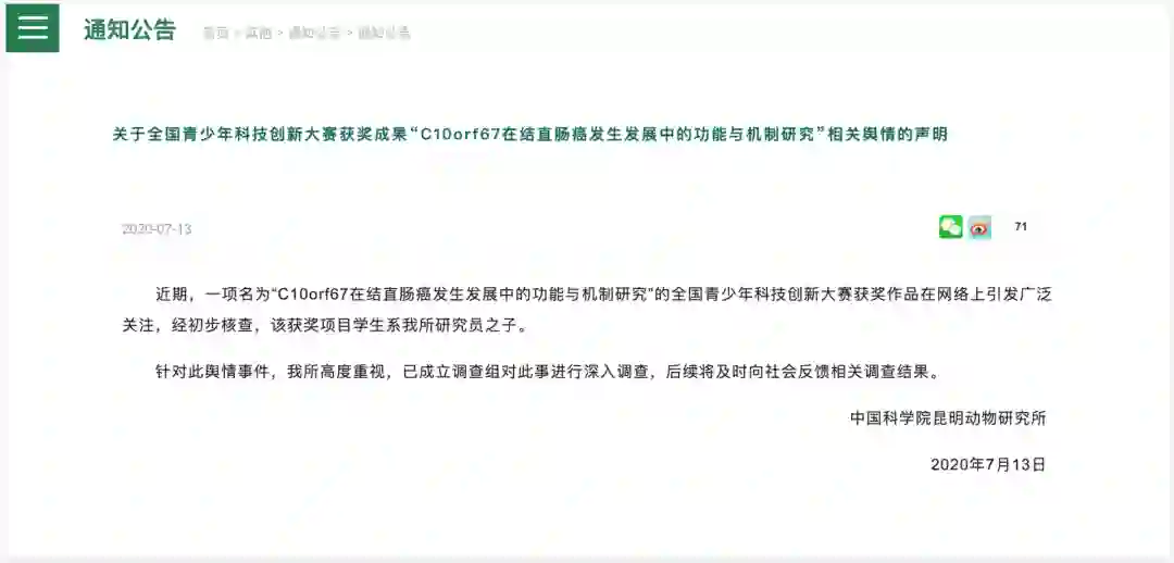 关于陈某石小朋友,7月13日,中国科学院昆明研究所在其网站发布了一则声明: