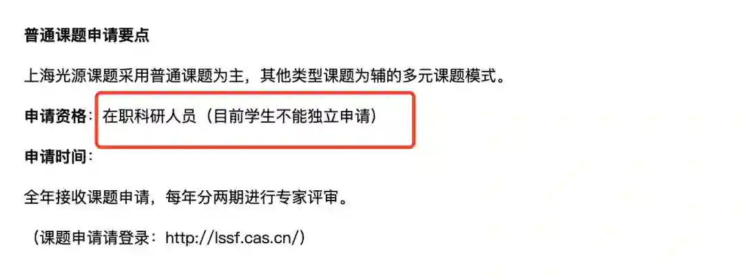 在上海同步辐射光源官网上,有这样一个机时申请资格:在职科研人员,特别强调的是,目前学生不能独立申请。