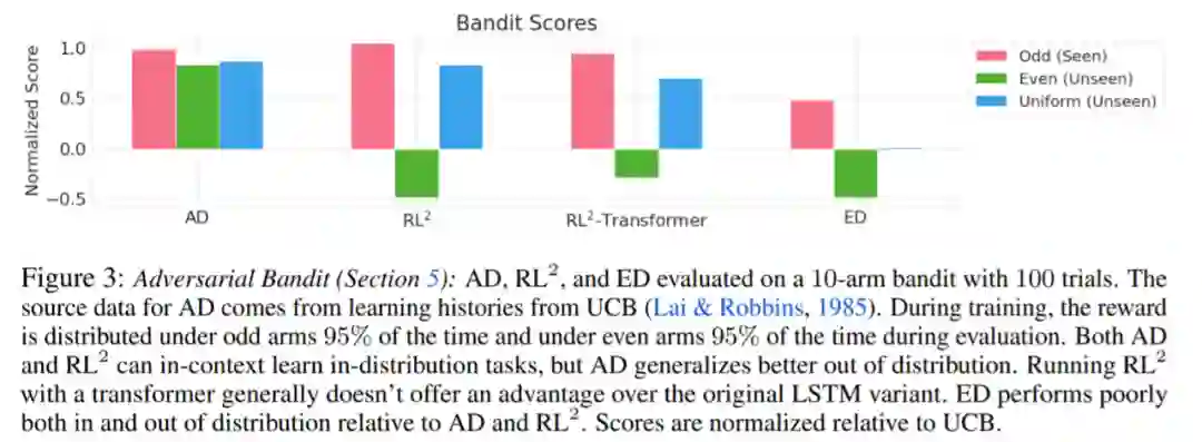 评估 AD、ED、 RL^2 结果如图 3 所示。该研究发现 AD 和 RL^2 都可以在上下文中学习从训练分布中采样的任务,而 ED 则不能,尽管 ED 在分布内评估时确实比随机猜测做得更好。