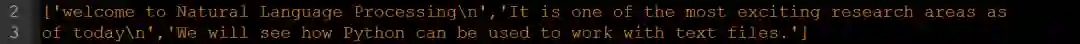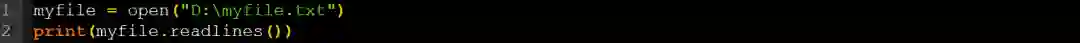 我们也可以逐行读取文件内容,而不是一次读取文件的所有内容。为此,我们需要执行readlines()方法,该方法可以将文本文件中的每一行作为列表项返回。