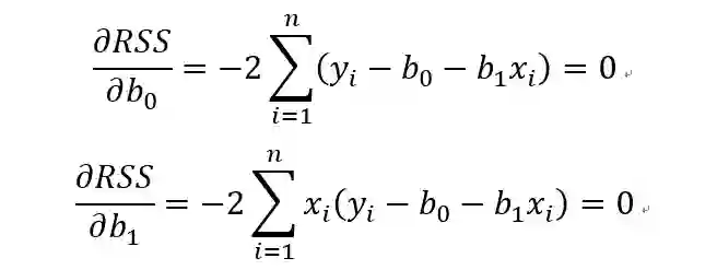 RSS中有2个未知参数b0和b1,为了求RSS的最小值,根据多元函数求极值的方法,分别对b0和b1求偏导数,并令导数为0.