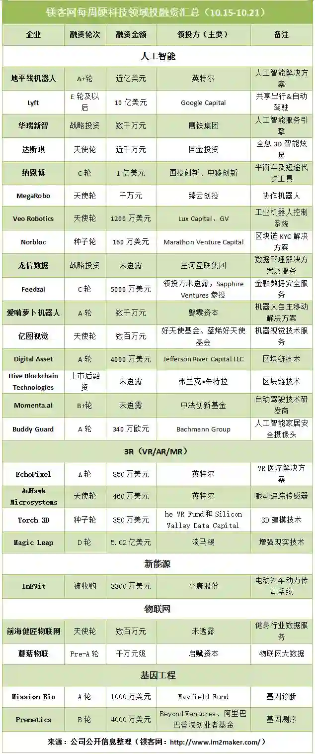 在本周的投融资中,最引人关注的共有3起投融资事件,分别是谷歌对于Lyft的投资,英特尔对于地平线机器人的投资以及Magic LeapE轮融资。前两起事件体现了谷歌和英特尔两大巨头对于自动驾驶的关注和布局,再次验证了自动驾驶是未来趋势。至于Magic Leap的融资,此前曾有传言其将在接下来的6个月内推出自己的首款产品,而对于这一笔融资作何用处,我们暂时还不知晓。