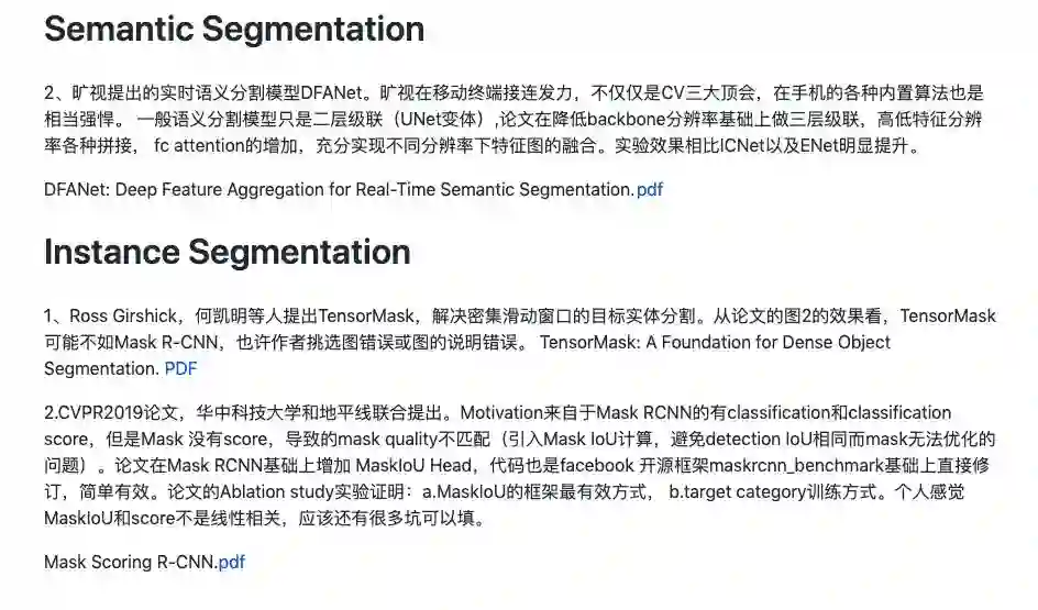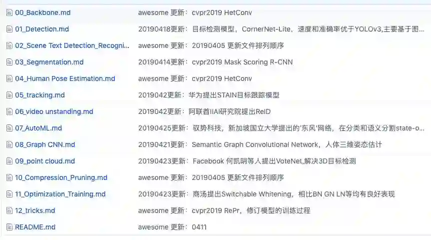 从内容上来看,总共分为12类,包括:Backbone、Detection、场景文本检测、分割、人体姿态评估、Tracking、视频理解、AutoML、Graph CNN、Point Cloud、压缩剪切、优化训练、训练技巧等。