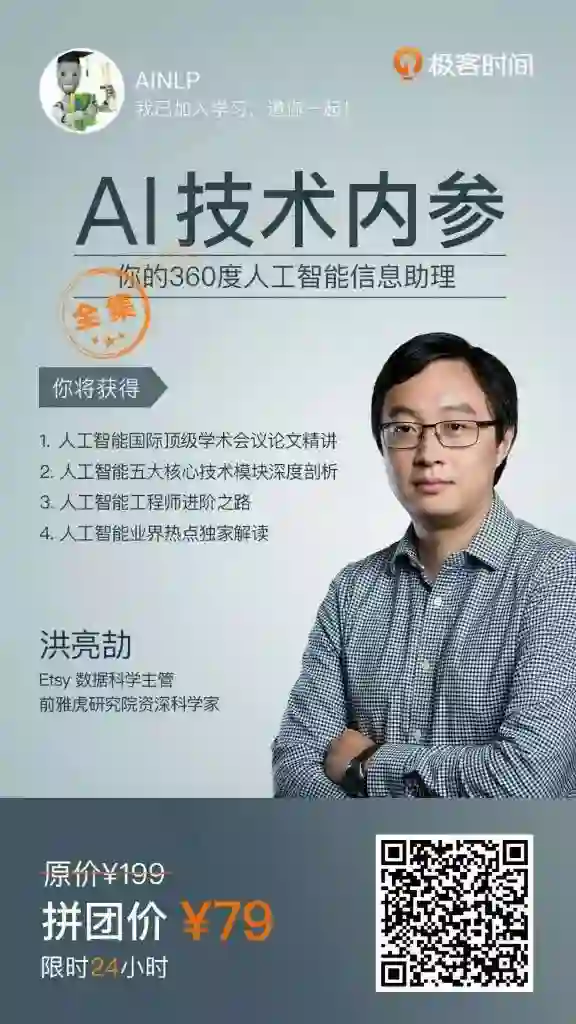 最近被安利了一个极客时间的专栏:《AI技术内参》,作者是洪亮劼老师,美国Etsy工程总监,前雅虎研究院高级研发经理。选了一些章节试读,觉得可以安利一下这个专栏,好东西要分享,希望你能耐心看完这篇文章。通过这个专栏大概可以一窥工业界的一些玩法,工业界和学术界的碰撞,另外从目录来看这个专栏覆盖的范围也很广,包括自然语言处理、计算机视觉、数据科学、推荐系统、广告系统、搜索核心技术的传统机器学习方法和新的深度学习方法。这个专栏目前已经完结,稍微花一些时间大概就可以看完或者听完,从现在开始到5月4日24时,79元,大概一本书的价格,感兴趣的同学可以参与: