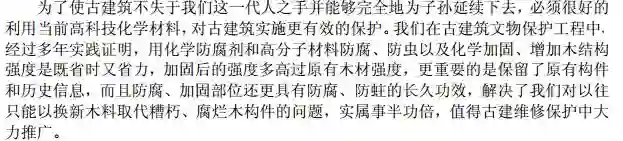这篇论文读起来有一种强烈的撕裂感,如第一段在持续论述绿色化学的定义与意义,和文章题目或是接下来第二段的化学防腐技术在古建筑保护工程中的应用几乎没有任何联系,两段之间亦无过渡。这种撕裂感在从第二个标题开始的文章主题部分开始变得更为明显。作者大段论述的“绿色化学技术的种类”可以说同文章的主题没有丝毫联系,同后文更没有任何逻辑上的关系。坦率地说,梁同学这篇不足两页的论文中的第一页完全是在复述一些定义。