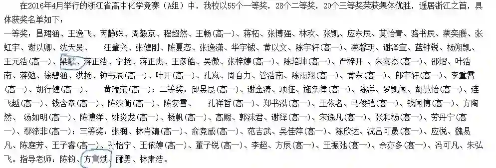 梁同学的母校杭州市第二中学在该生自主招生材料准备过程中有无参与,目前尚不可知。不过根据下面该校2016年的大事记来看,本文的第二作者方文斌的确很可能系该校化学教师。在当年的浙江省高中化学竞赛中,梁同学获得了一等奖,而指导教师正是方文斌。