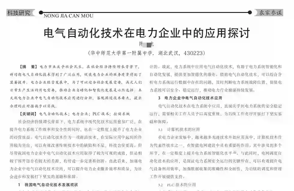 4、华中师范大学附属第一中学陈同学的《电气自动化技术在电力企业中的应用探讨》(2018年发表于《农家参谋》第23期)